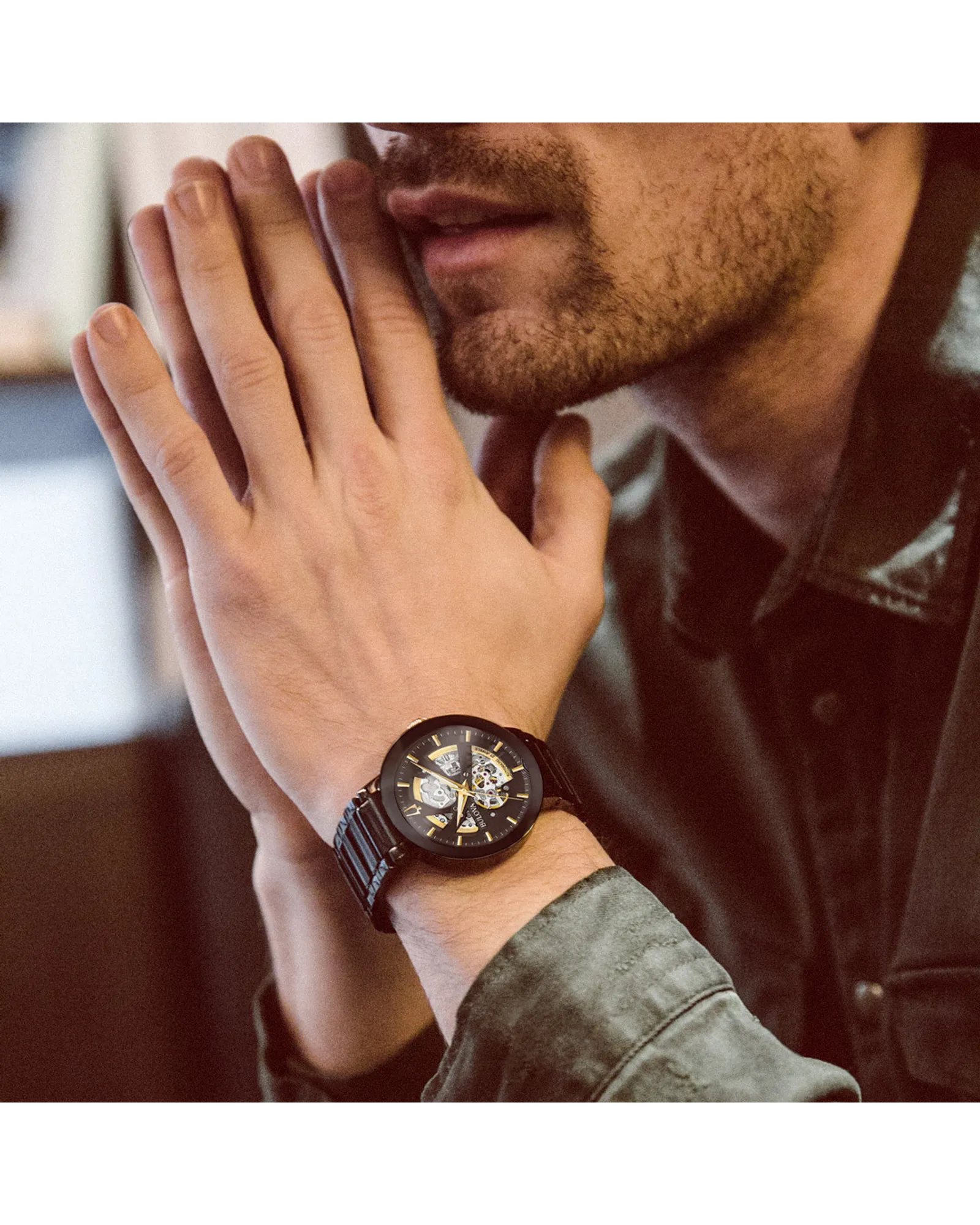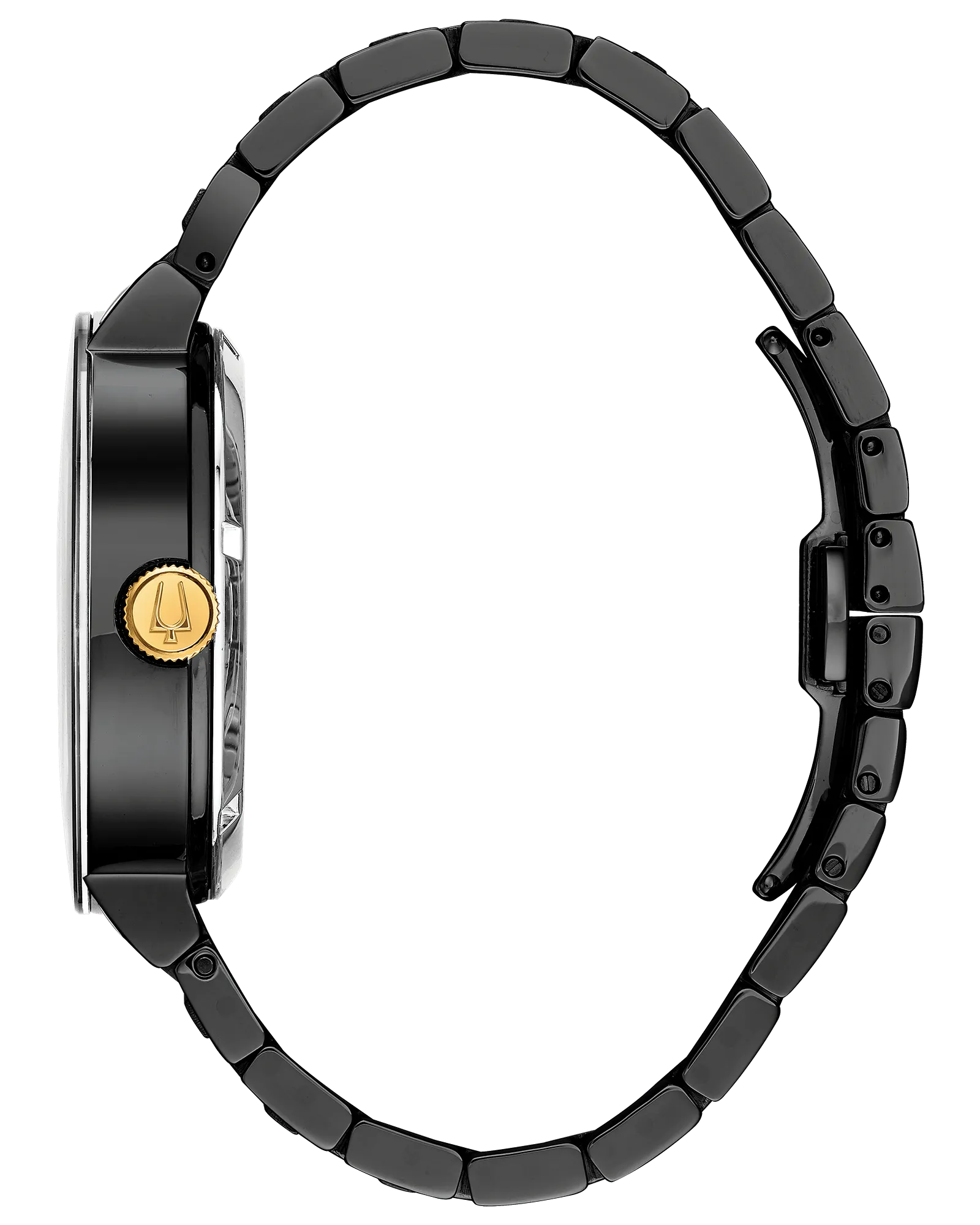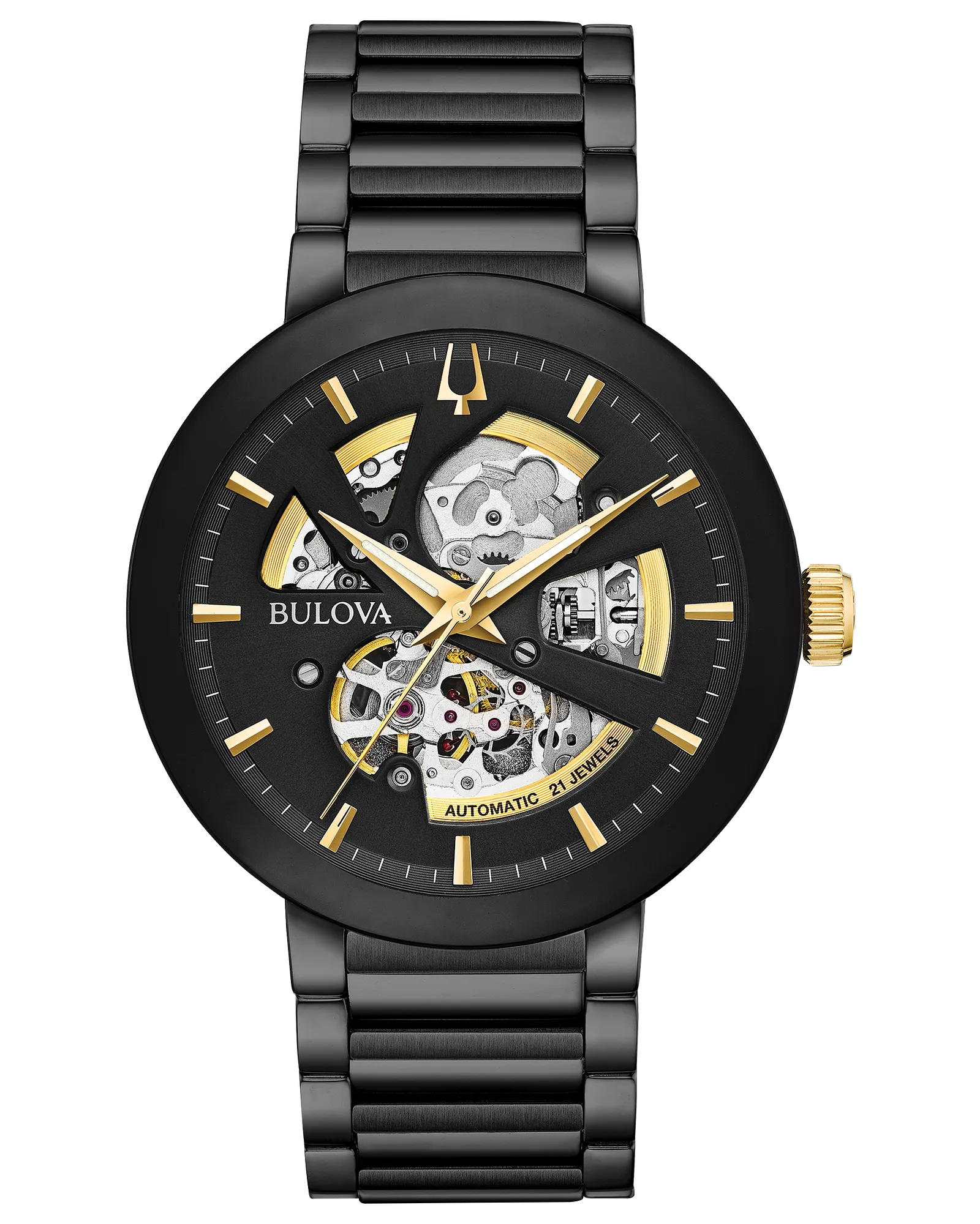 In black IP stainless steel, automatic self-winding movement with 40-hour power reserve and open aperture black dial with gold-tone accents, domed mineral glass, screw-back case, black IP stainless steel bracelet with double-press deployment closure. Model #: 98A203 Show More Show Less