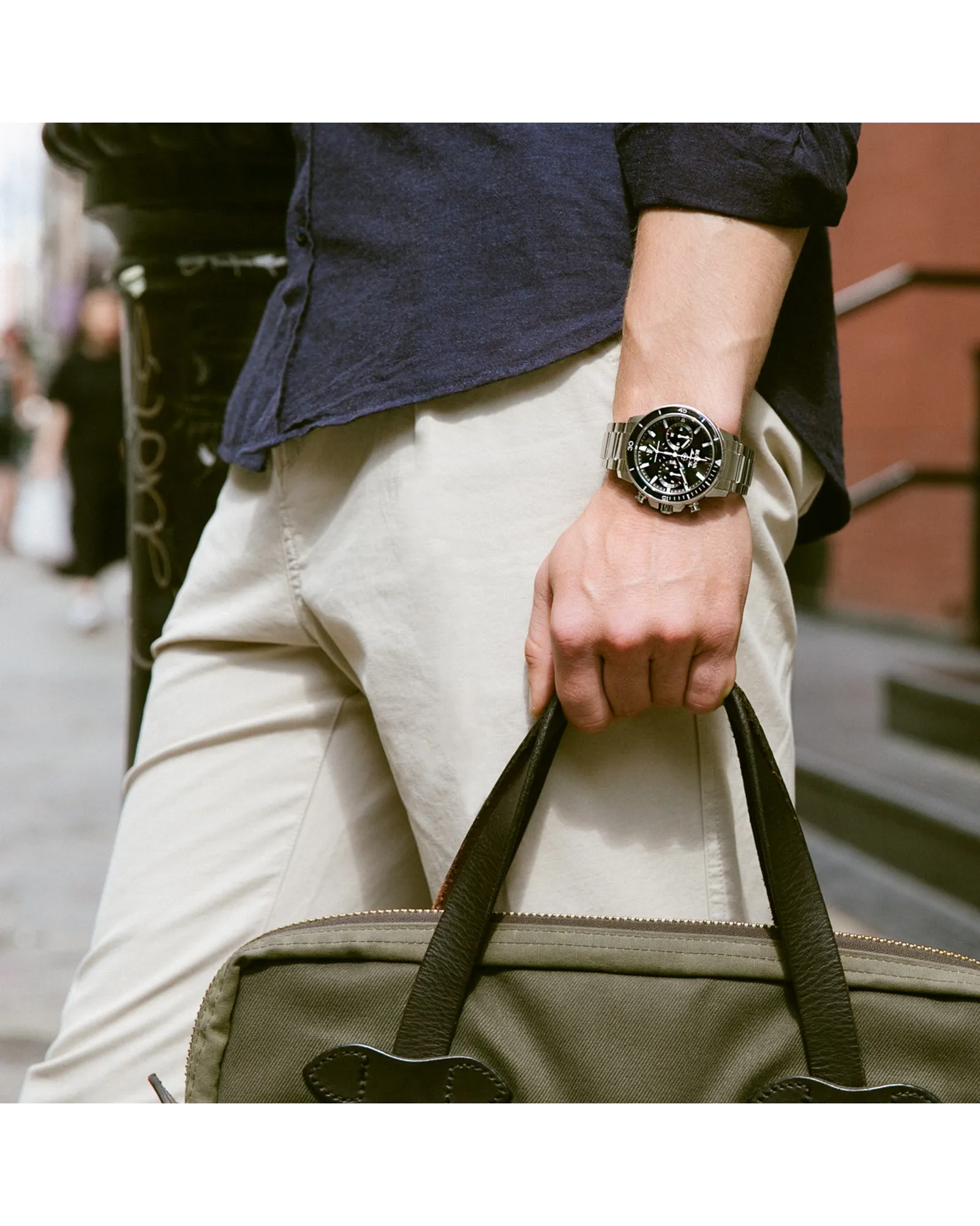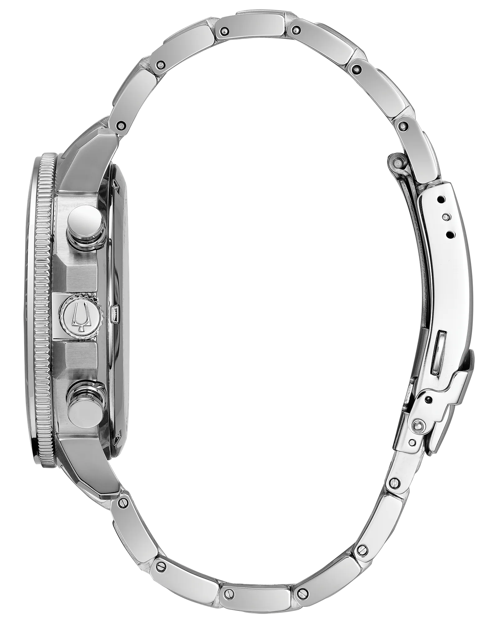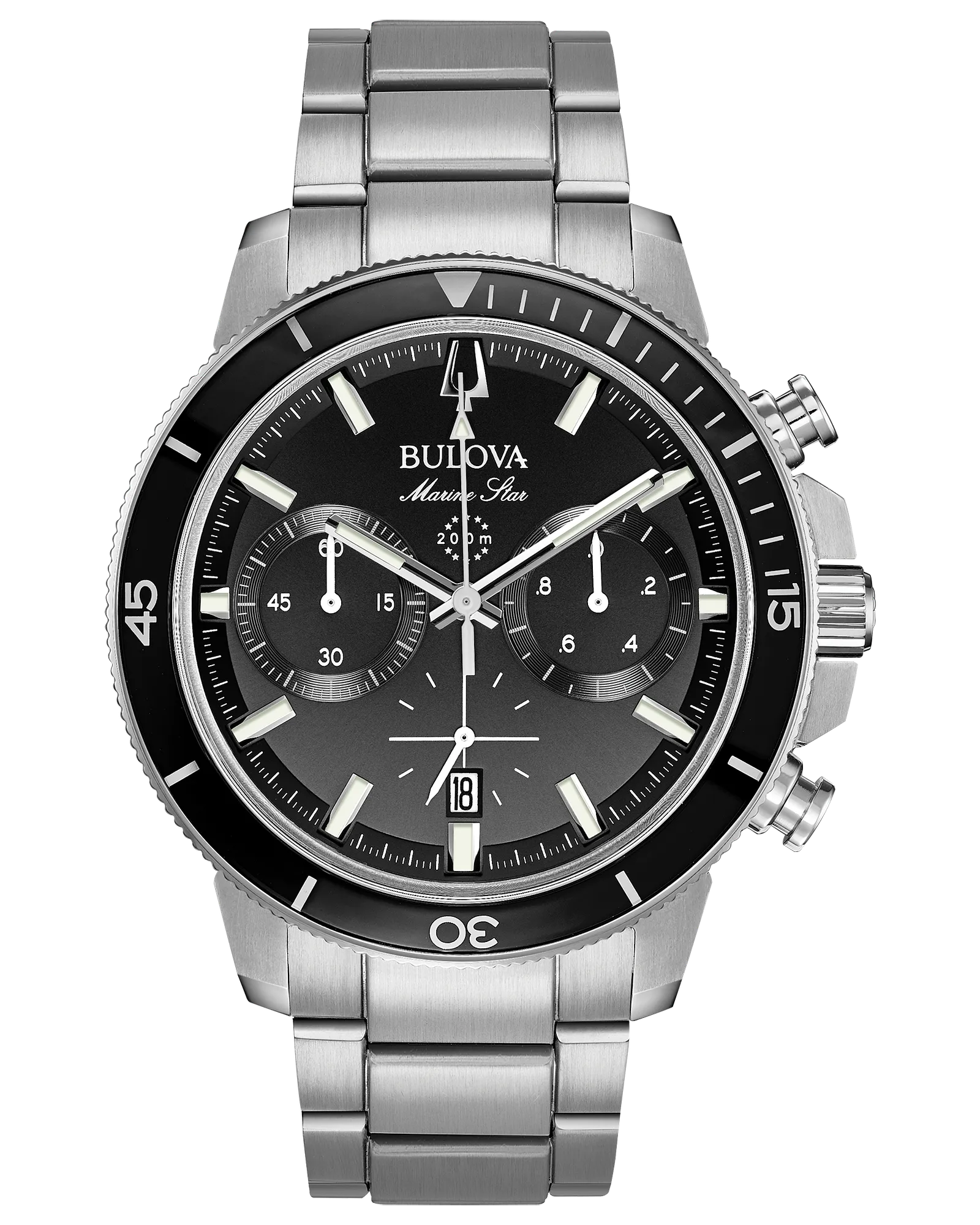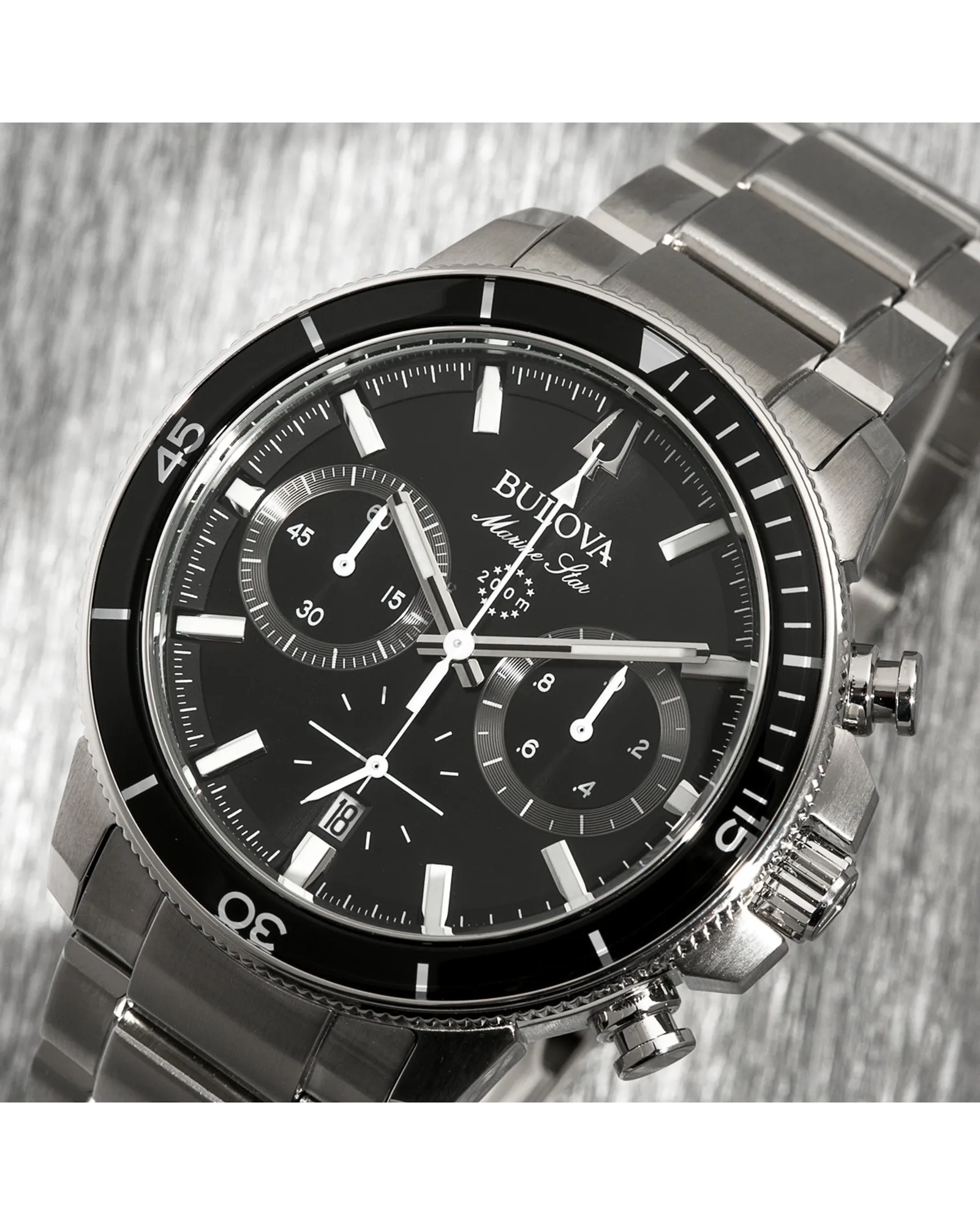 From the Marine Star Collection. New six-hand chronograph movement with 200-meter water resistance. In stainless steel with black glass insert on ratcheted rotating bezel, black dial with luminous hands and markers, and calendar feature, domed mineral crystal, screw-back case, stainless steel bracelet with fold-over buckle closure, safety bar and extender. Model #: 96B272 Show More Show Less