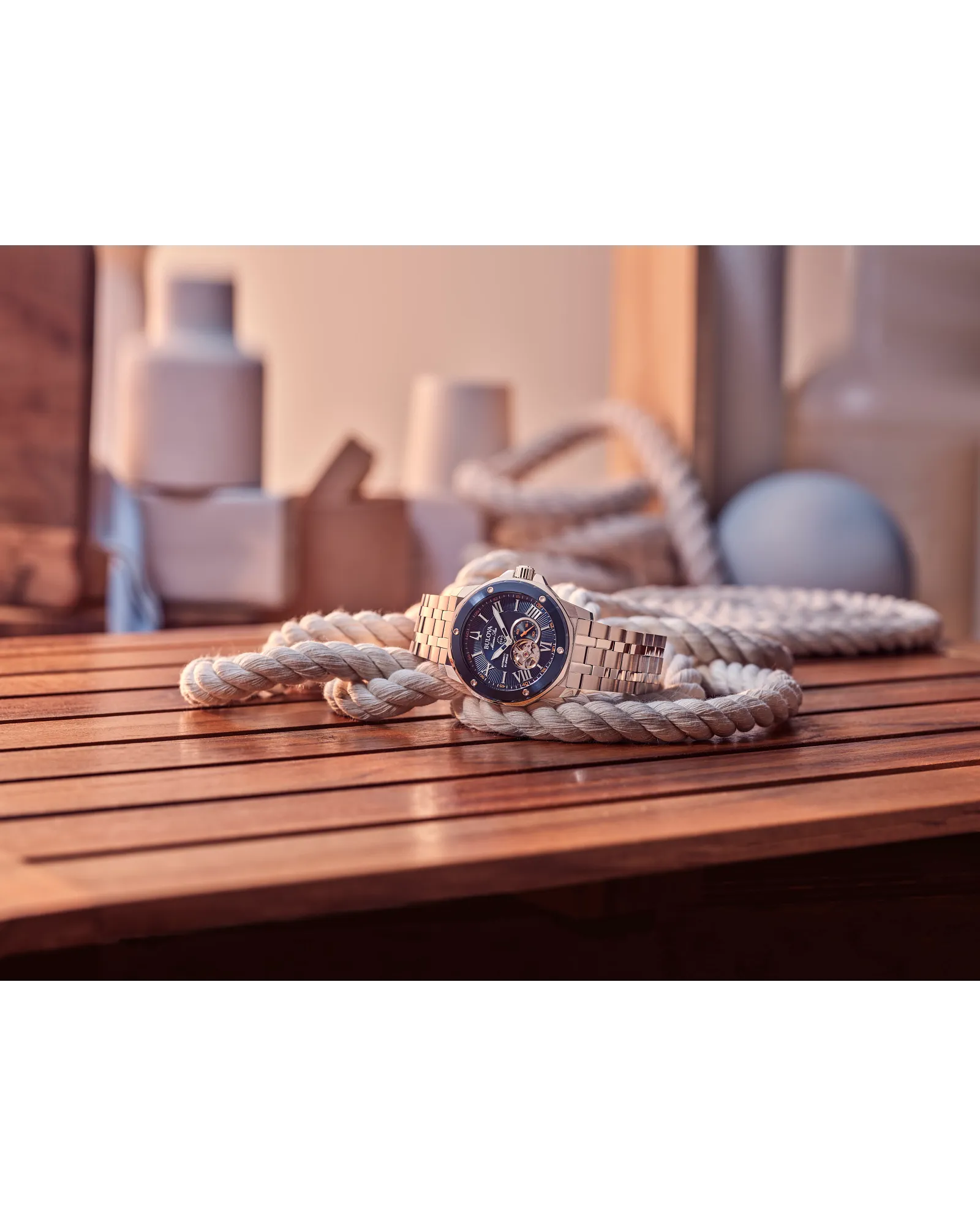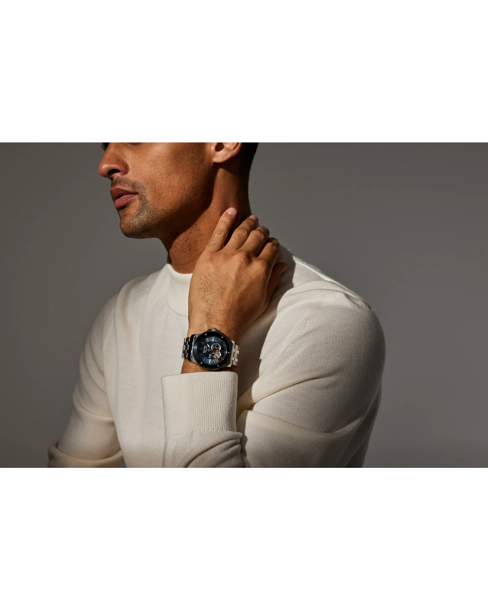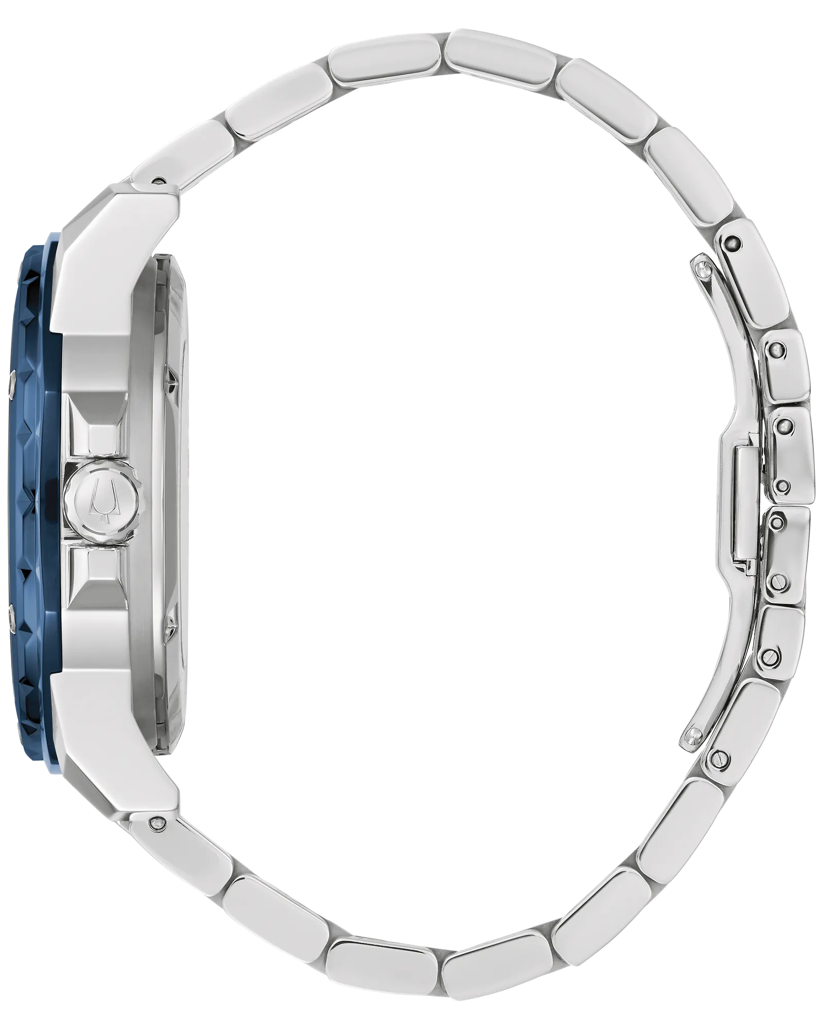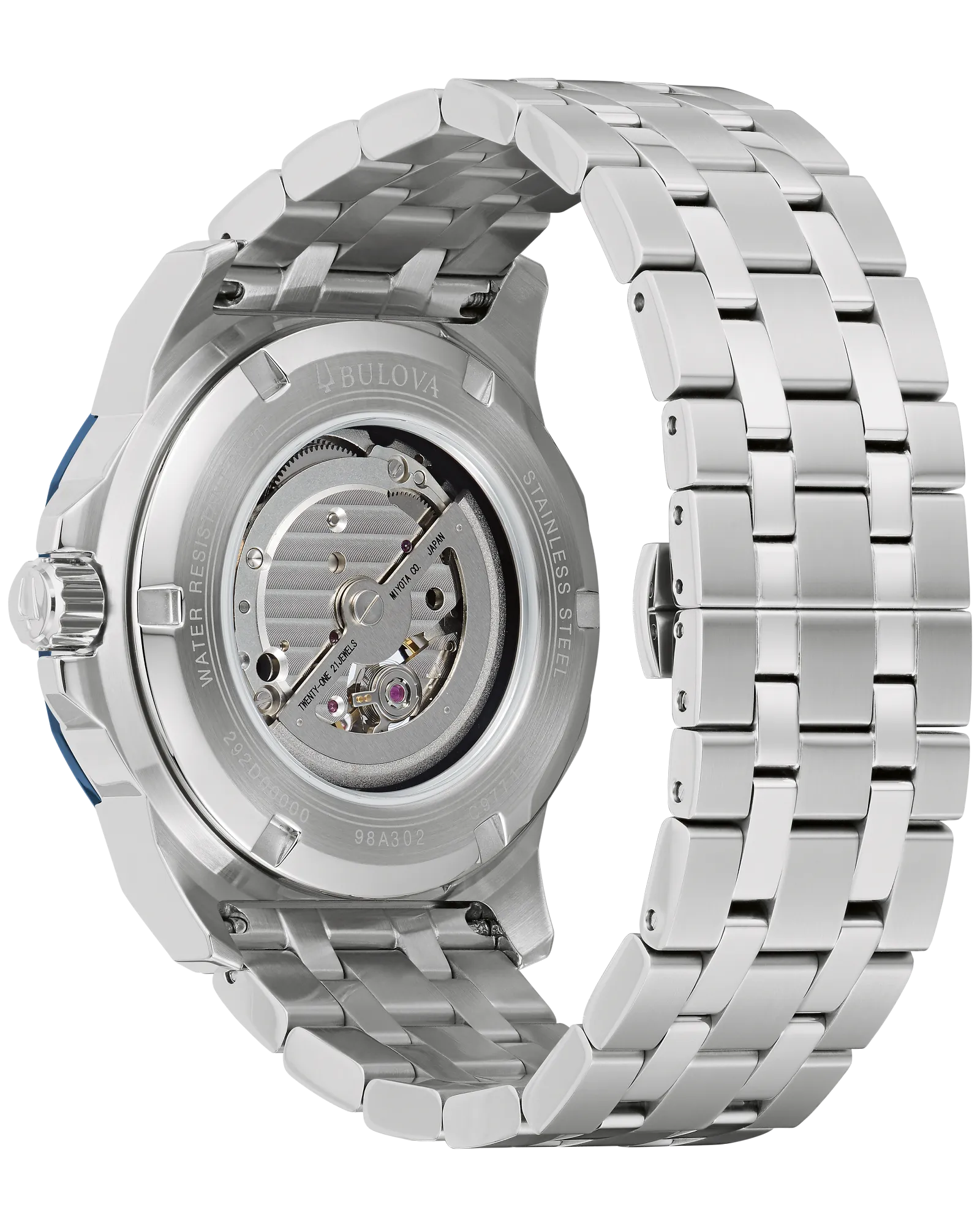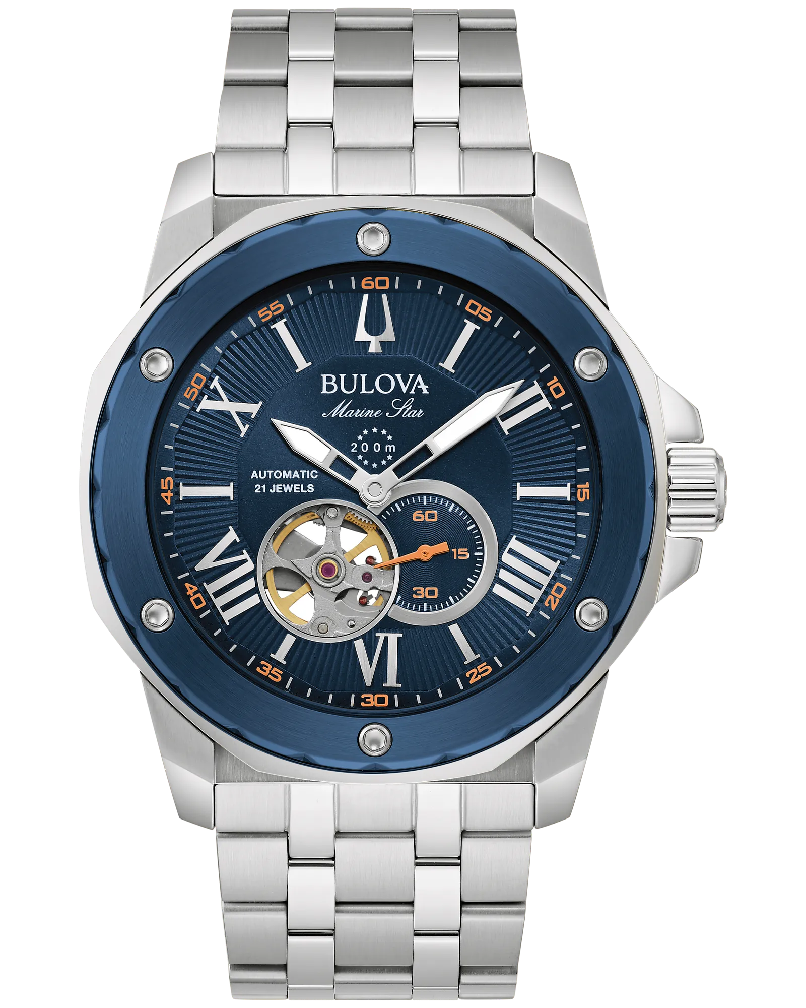 This new Bulova Marine Star men’s watch combines classic nautical styling with a legacy that reaches back decades. The bold, angular silver-tone stainless steel case features brushed finishing with polished accents, a deep blue bezel, a flat mineral crystal, and a screw-down crown. The striking blue dial combines sunray texture along the hour track and a central dial with a radiant sunburst finish, complete with hands with luminescent treatment, polished indices, and a running seconds sub-dial with orange accents. Visible through both the dial aperture and an exhibition case back, the open heartbeat automatic movement features 21 jewels and a 42-hour power reserve. The 45mm watch is compleme