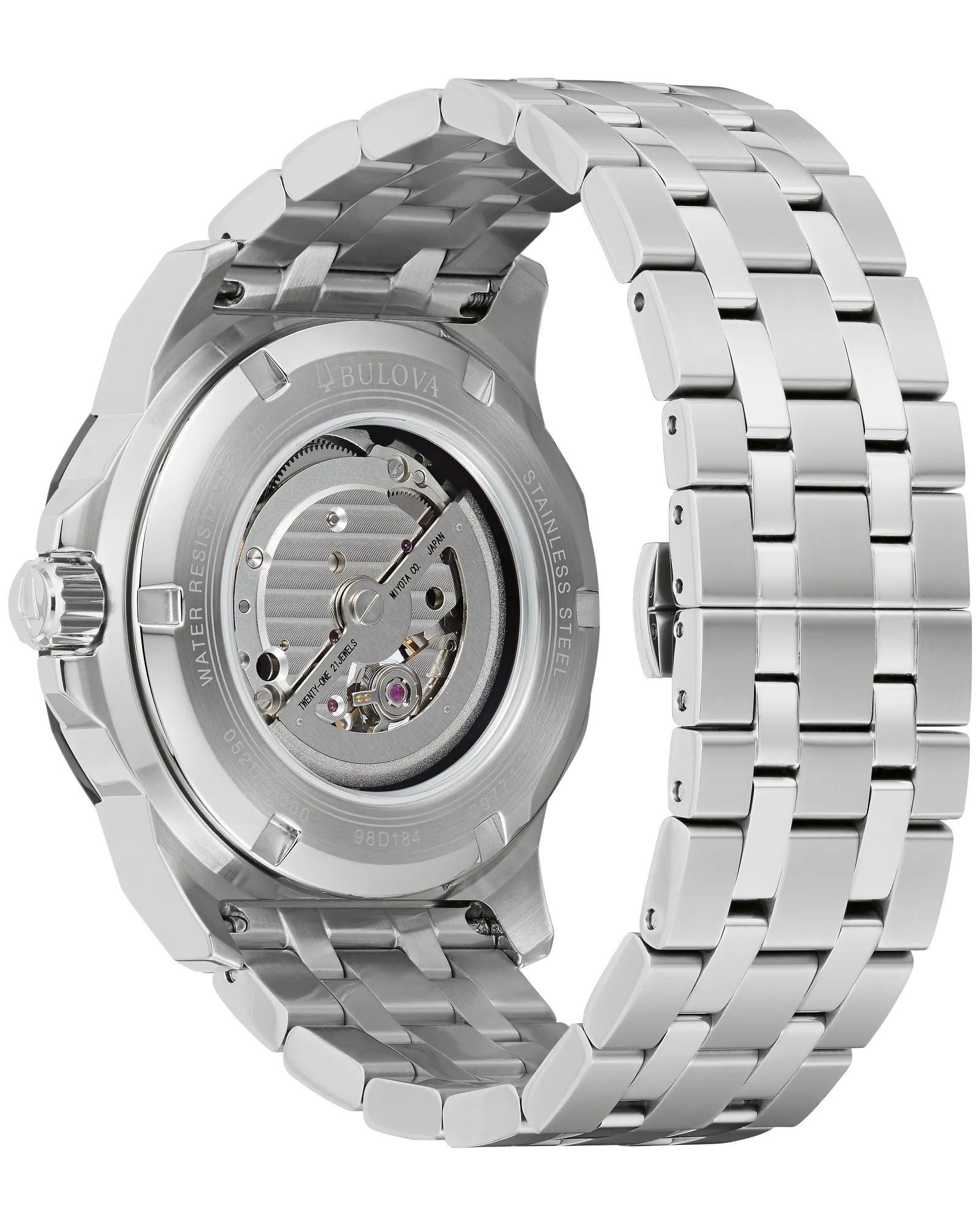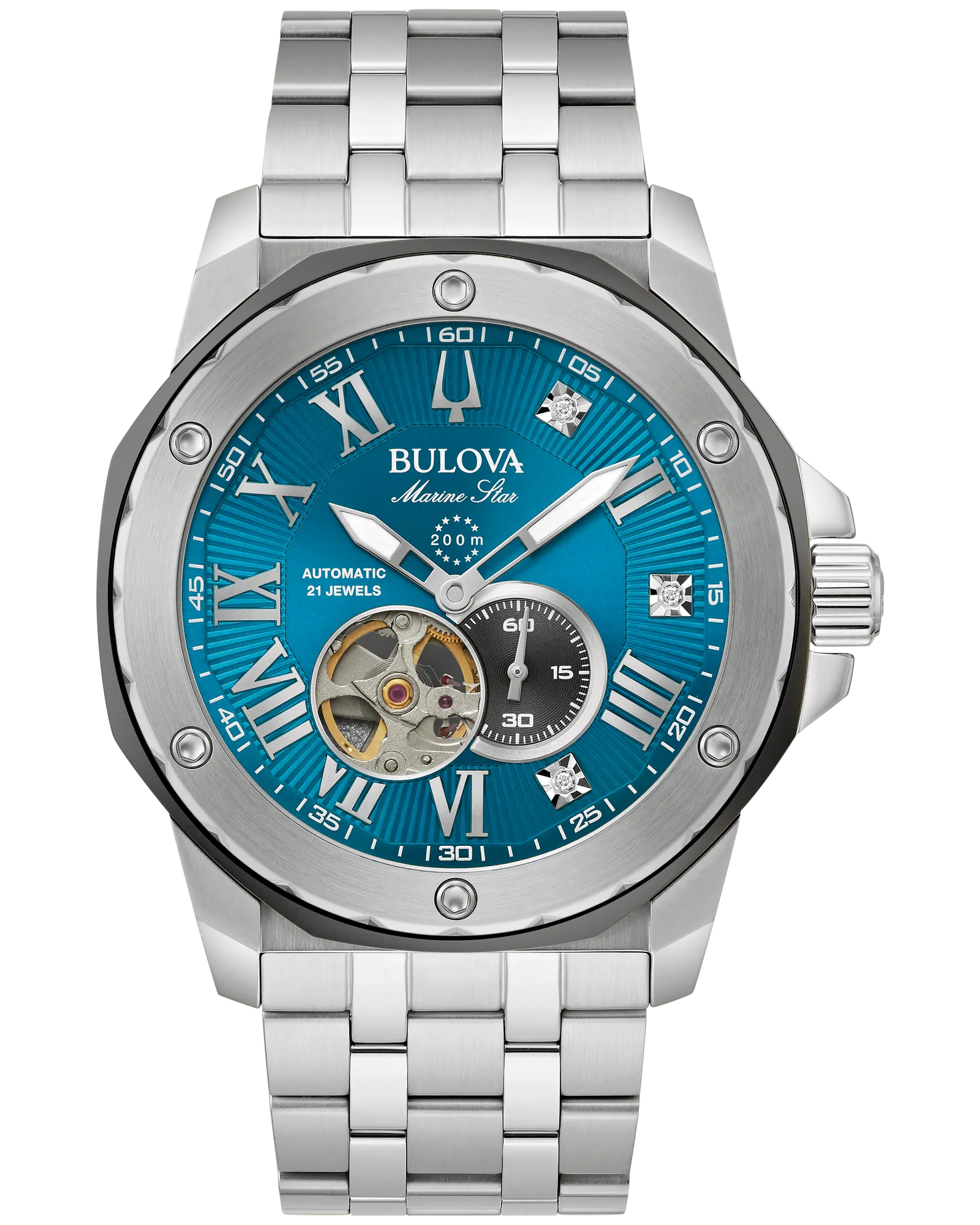Capturing the daring style of Marc Anthony, one of music’s most influential artists, Bulova presents the all-new Marc Anthony Series A. The bold, angular silver-tone stainless steel case features brushed finishing with polished accents, a silver-tone bezel with grey accents, a flat mineral crystal, and a screw-down crown. The stunningly vibrant blue dial combines sunray texture along the hour track and a central dial with a radiant sunburst finish, complete with hands with luminescent treatment, polished indices, and a grey running seconds sub-dial. The dial is further accented with diamond hour markers at 1, 3, and 5 o’clock, chosen by Marc for their personal significance. Visible through b