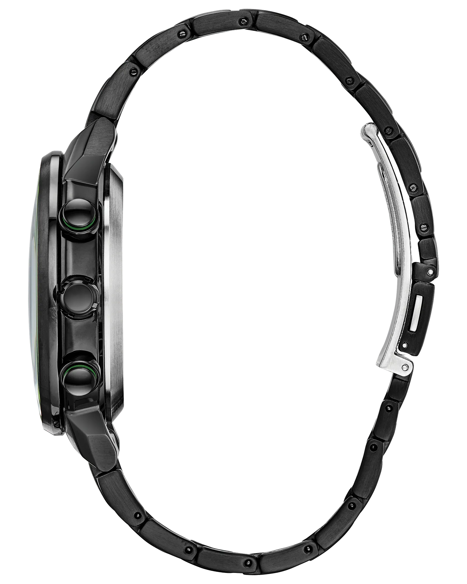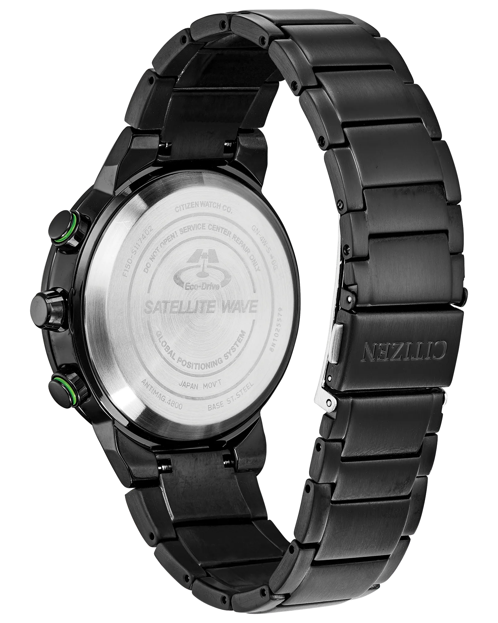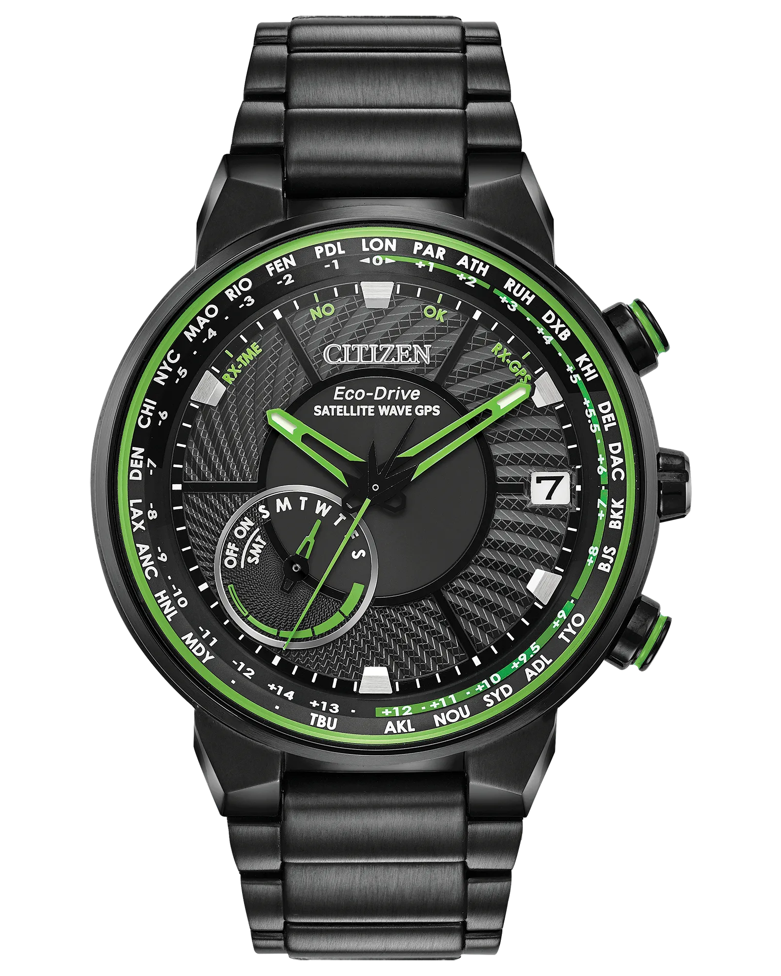 Bolder and brighter. Enhanced technical and architectural design; the new Citizen Satellite Wave GPS Freedom is the leader of the pack with the world’s fastest timekeeping signal reception speed from GPS navigation. A sleek black ion-plated stainless steel case and bracelet, black dial and brilliant green accents featured satellite GPS timekeeping technology with worldwide reception and time adjustment in 40 time zones. Powered by Eco-Drive technology – powered by light, any light. Never needs a battery. Caliber number F150. Model #: CC3035-50E Show More Show Less