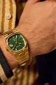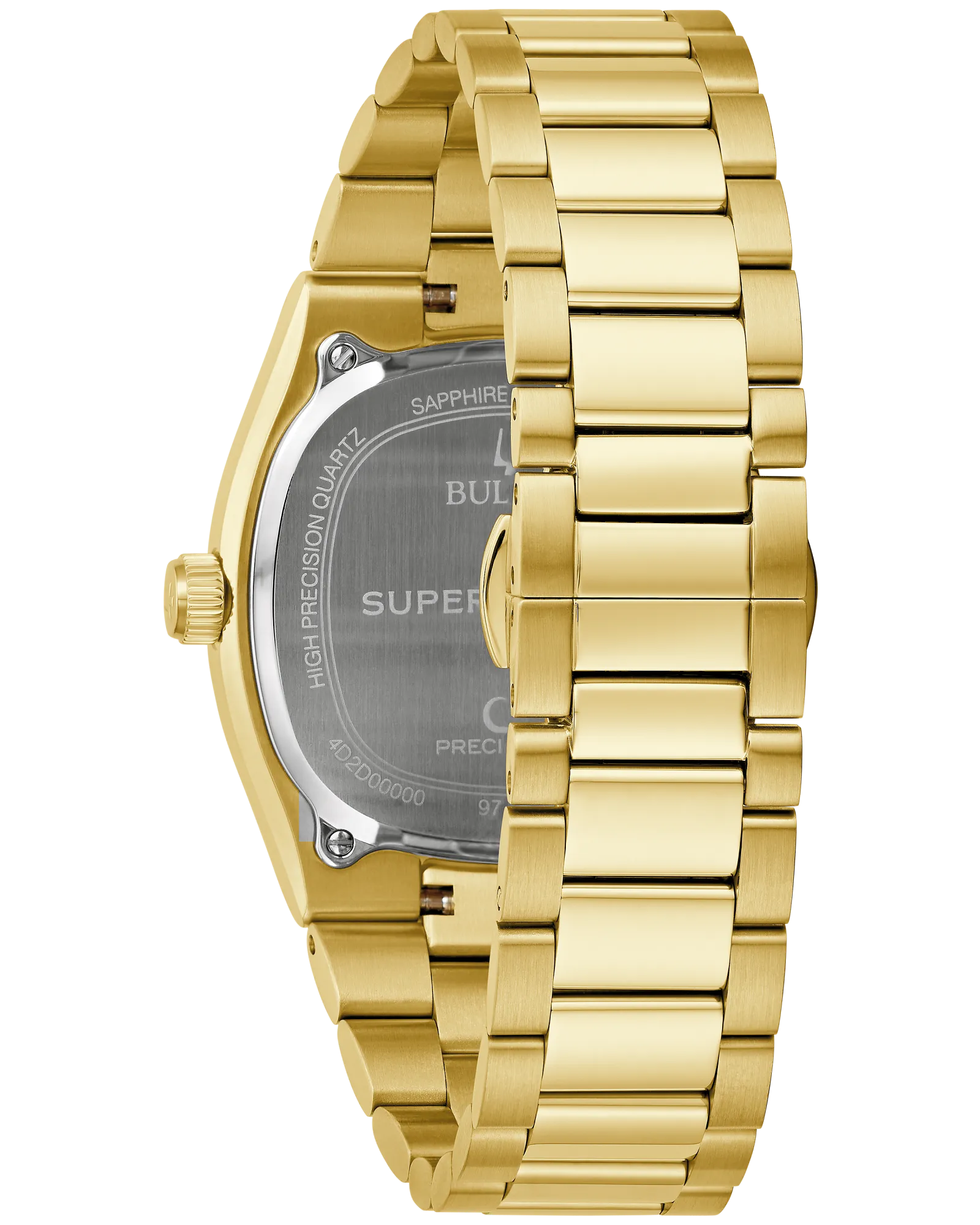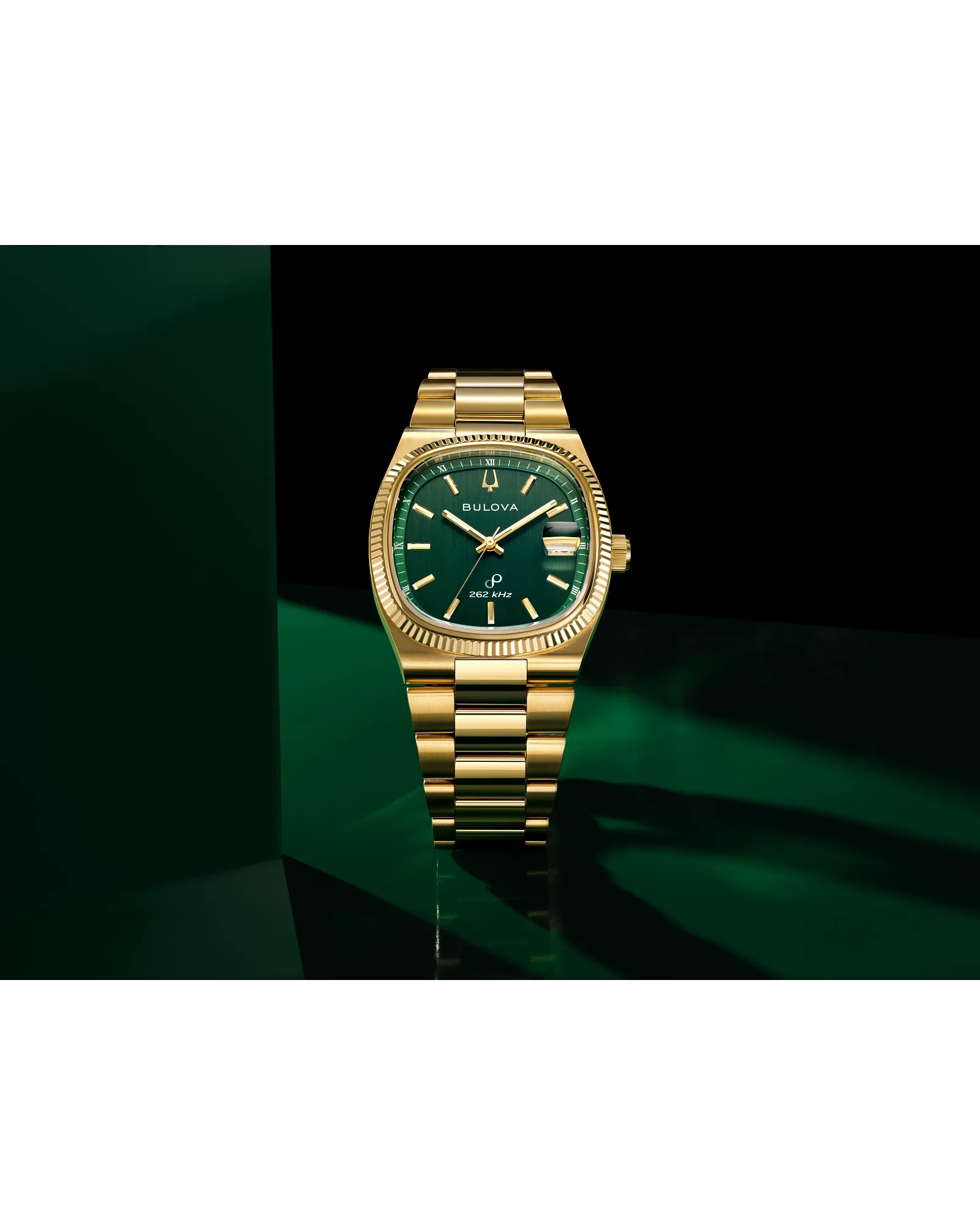 Drawing inspiration from the incredible Bulova Super Seville Day-Date of the 1970s, the men’s Bulova Super Seville merges retro aesthetics with state-of-the-art movement technology for timeless modern appeal. With versatility for every style, the gold-tone stainless steel 38mm case strikes a bold stance with a seamless silhouette created by the TV-shaped case transitioning into the matching integrated 3-link stainless steel bracelet, which features a push-button deployant clasp. An elegant, grooved coin edge bezel enhances the case and surrounds a flat sapphire crystal and its date magnifier. The compelling dial is a verdant vertical brushed green, with polished gold-tone hands and indices a