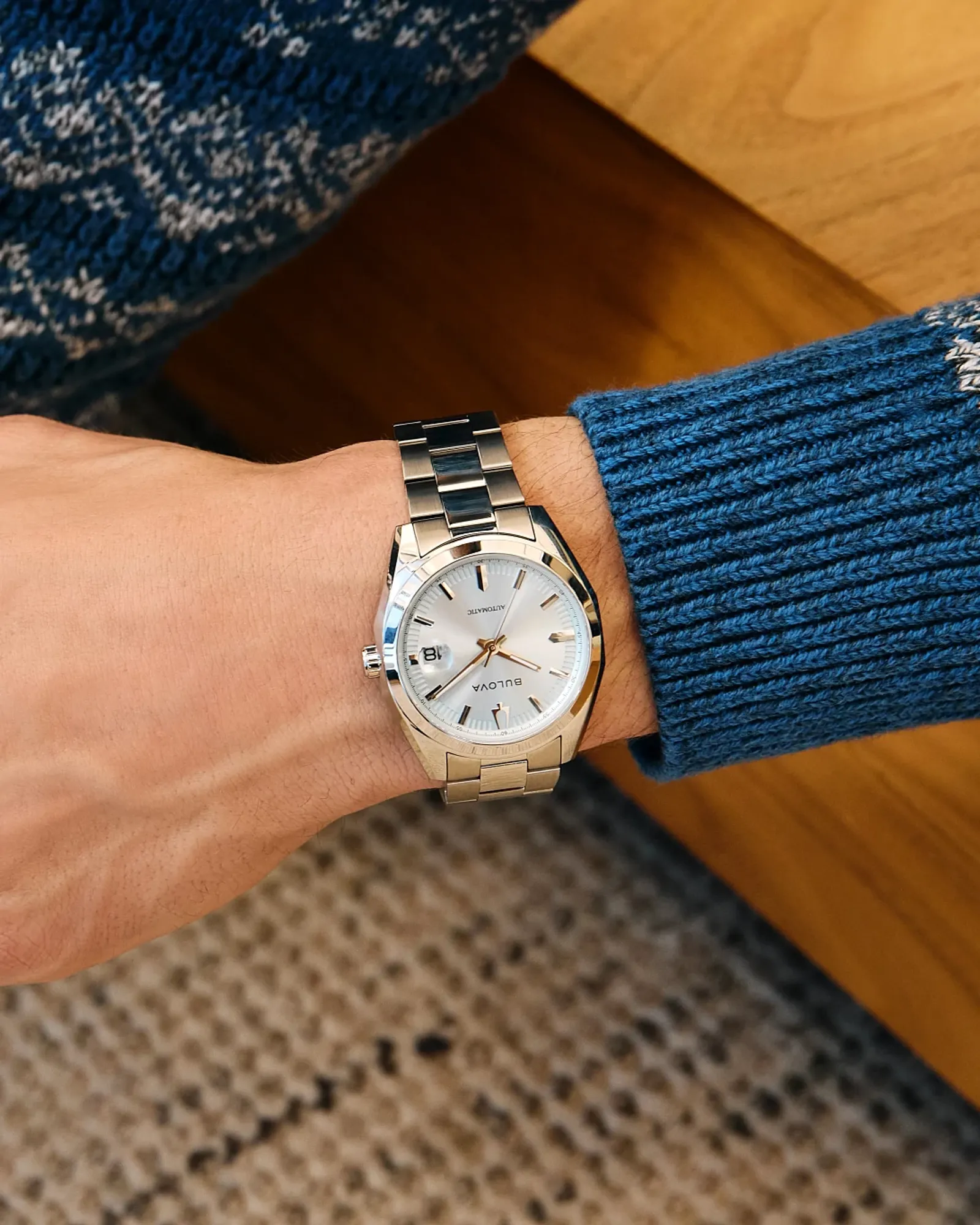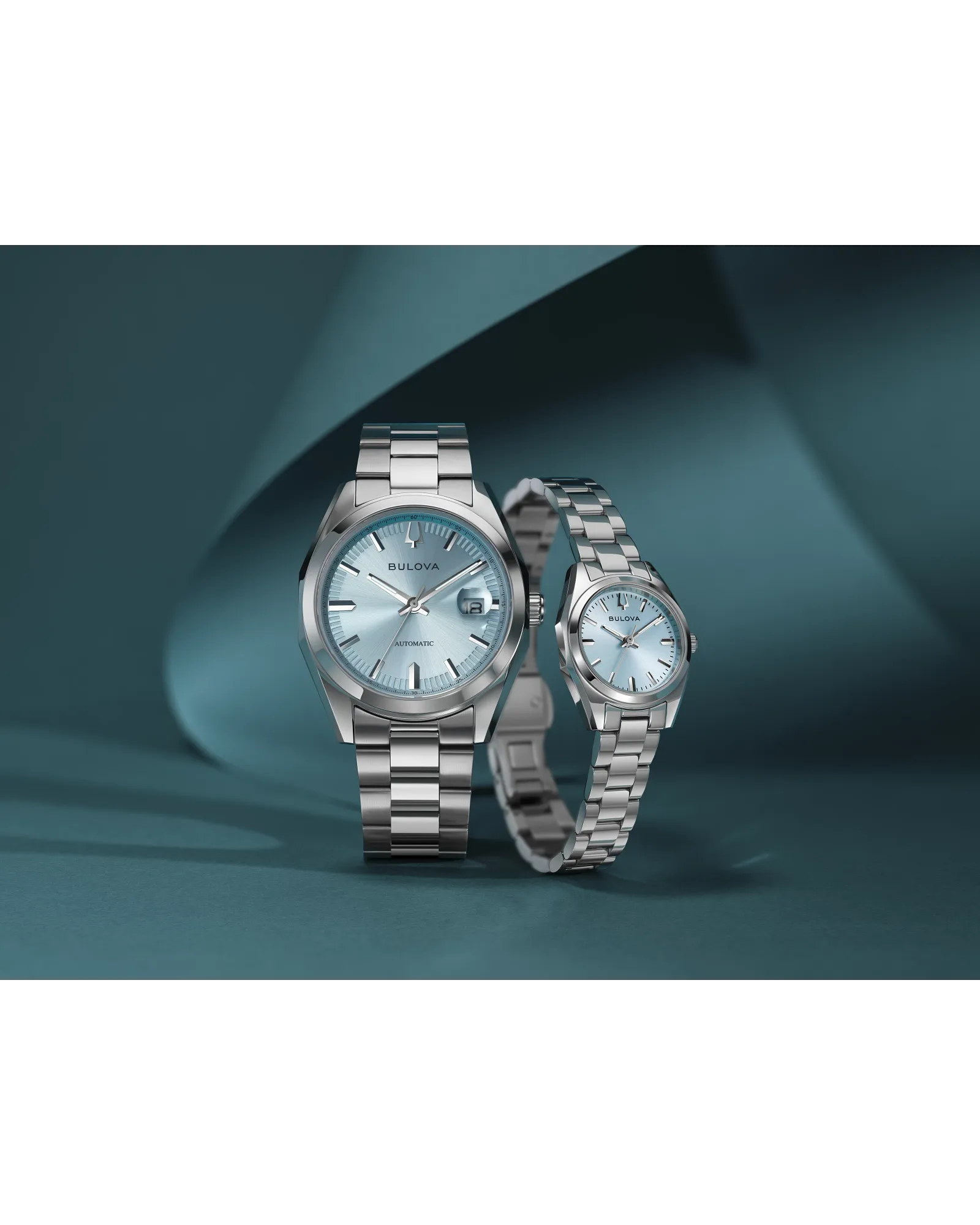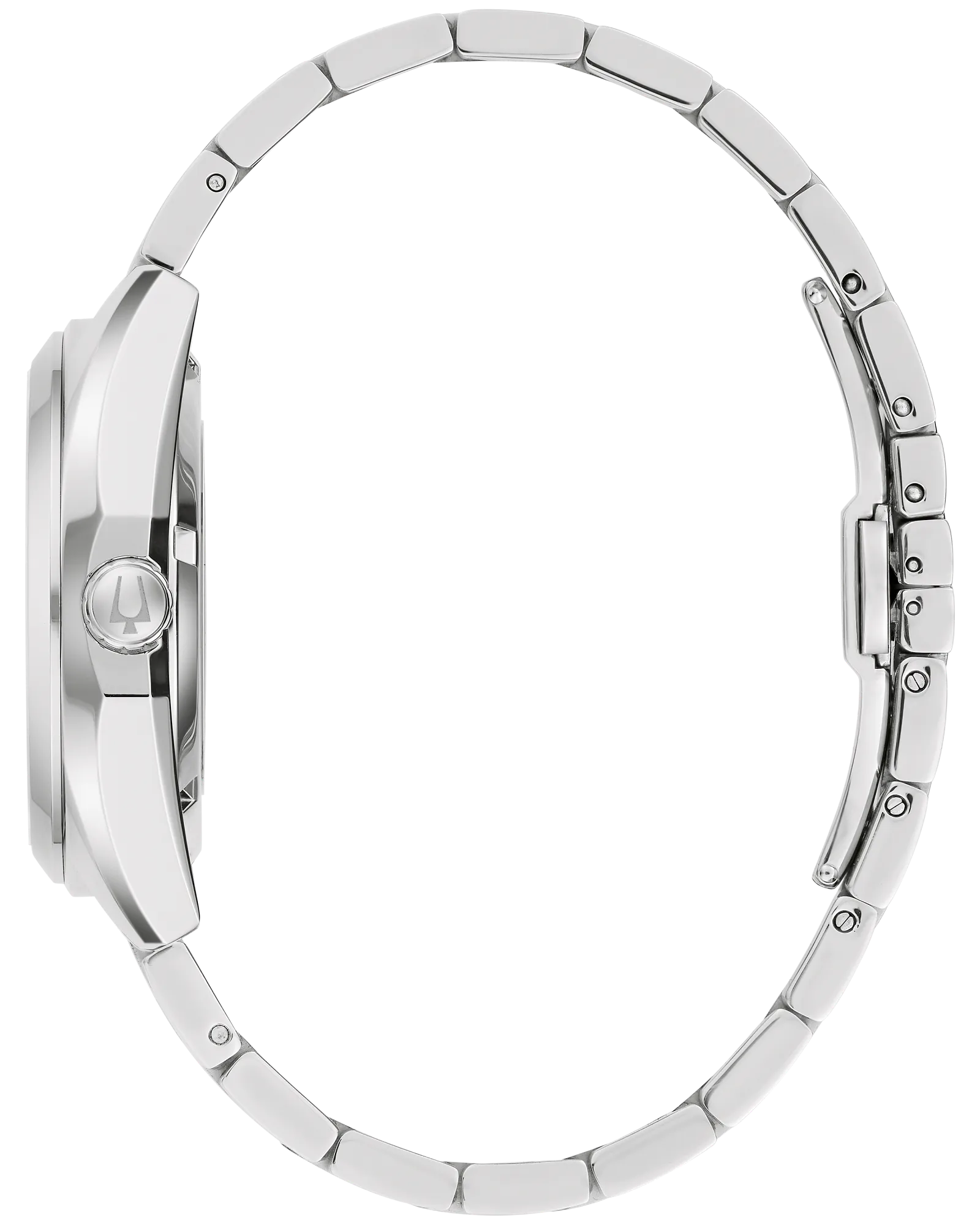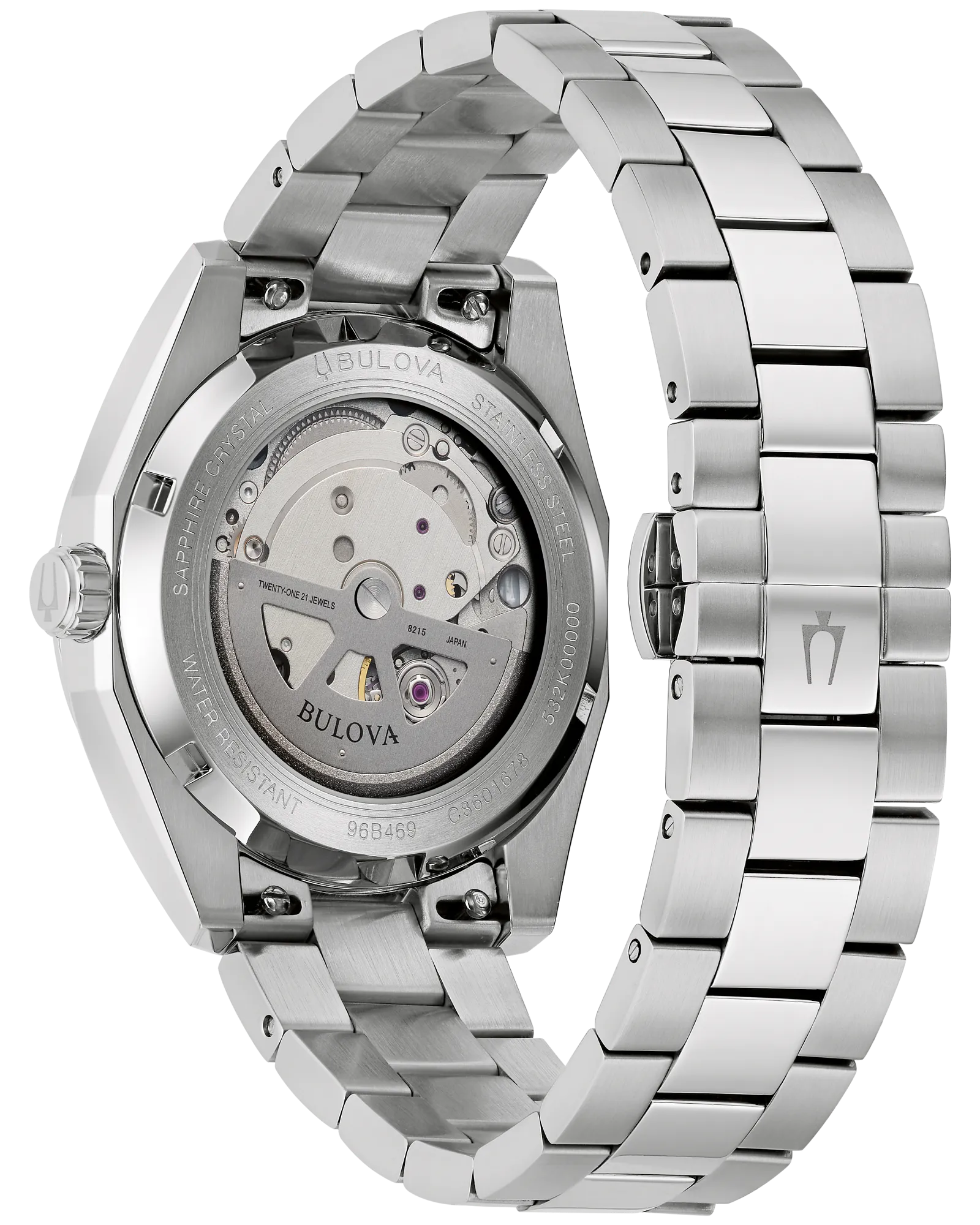 Defined by exceptional quality and sophisticated aesthetics, the Bulova men’s Surveyor is the quintessential modern timepiece. Sculpted edges and faceting distinguish the silver-tone stainless steel case, with polished and brushed finishing, a flat sapphire crystal, and a 3-link stainless steel bracelet with a push-button deployant clasp with easy-release latched spring bars. The radiant light blue dial has a sunburst finish and silver-tone accents, hands with luminescent fill, cutout minute markers, a magnified date display, and a recessed minute track. The watch is powered by an automatic movement with 21-jewels and a 42-hour power reserve, which can be seen through an exhibition window on