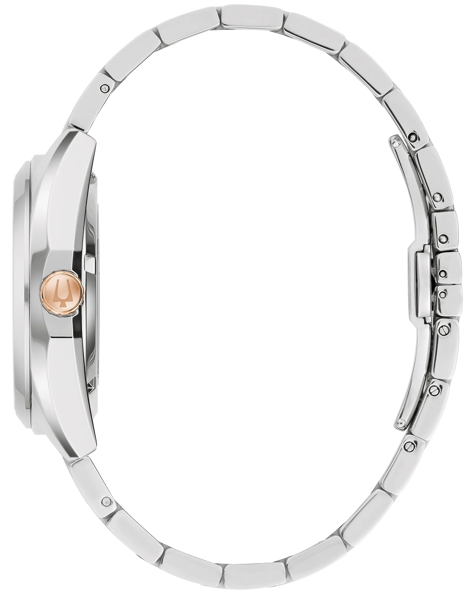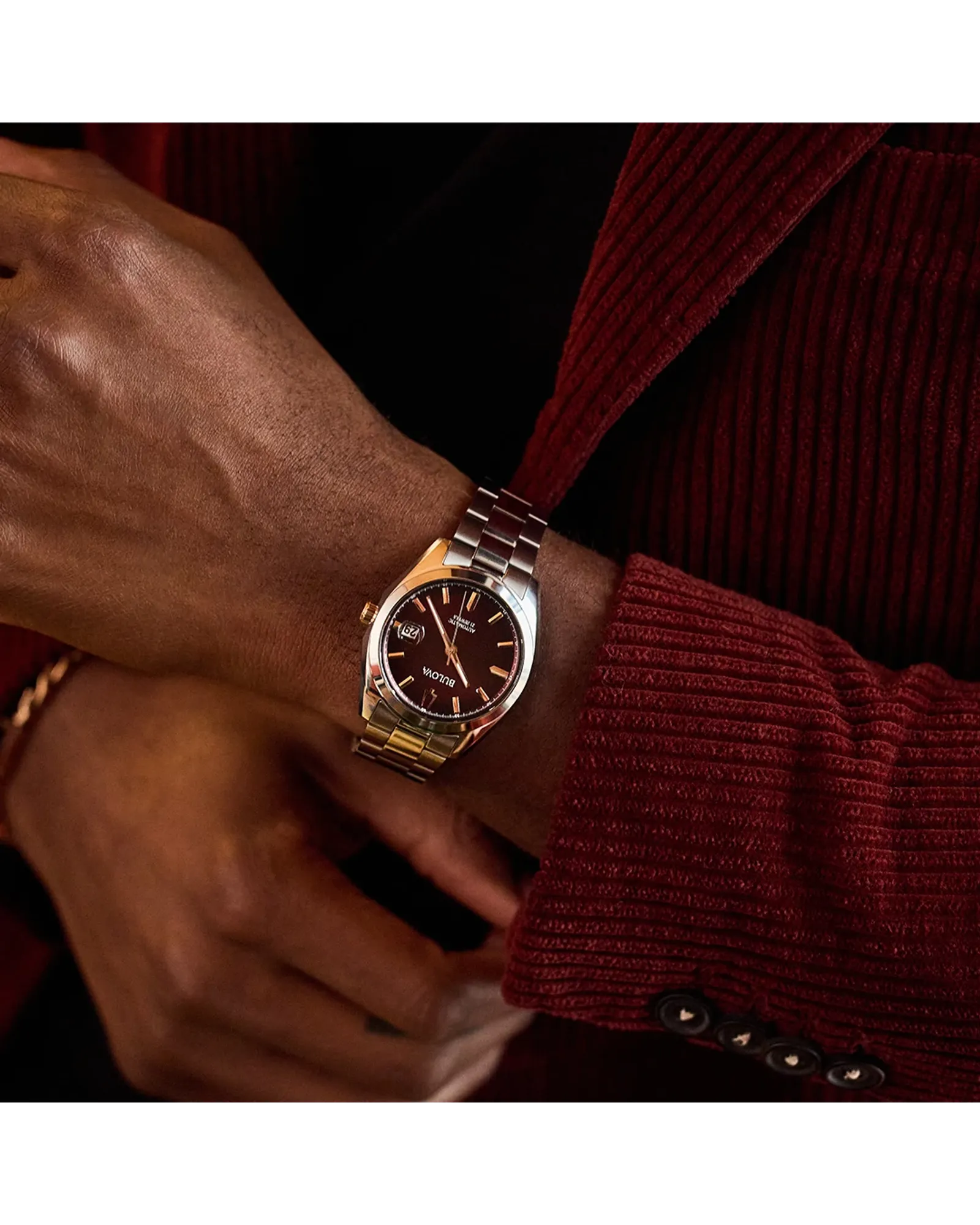 The Bulova men’s Surveyor is defined by exceptional quality and sophisticated aesthetics. The silver-tone stainless steel case features sculpted edges and faceting which provide an effortless wear on the wrist, with polished and brushed finishing, a flat sapphire crystal, and a matching quick-release 3-link stainless steel bracelet with a push-button deployant clasp. The rich burgundy dial has a sunburst finish and features rose gold-tone accents, hands with luminescent fill, debossed minute markers, and a magnified date display. The watch is powered by an 21-jewels and a 42-hour power reserve, which can be seen in full through a mineral crystal exhibition window in the caseback. For those w