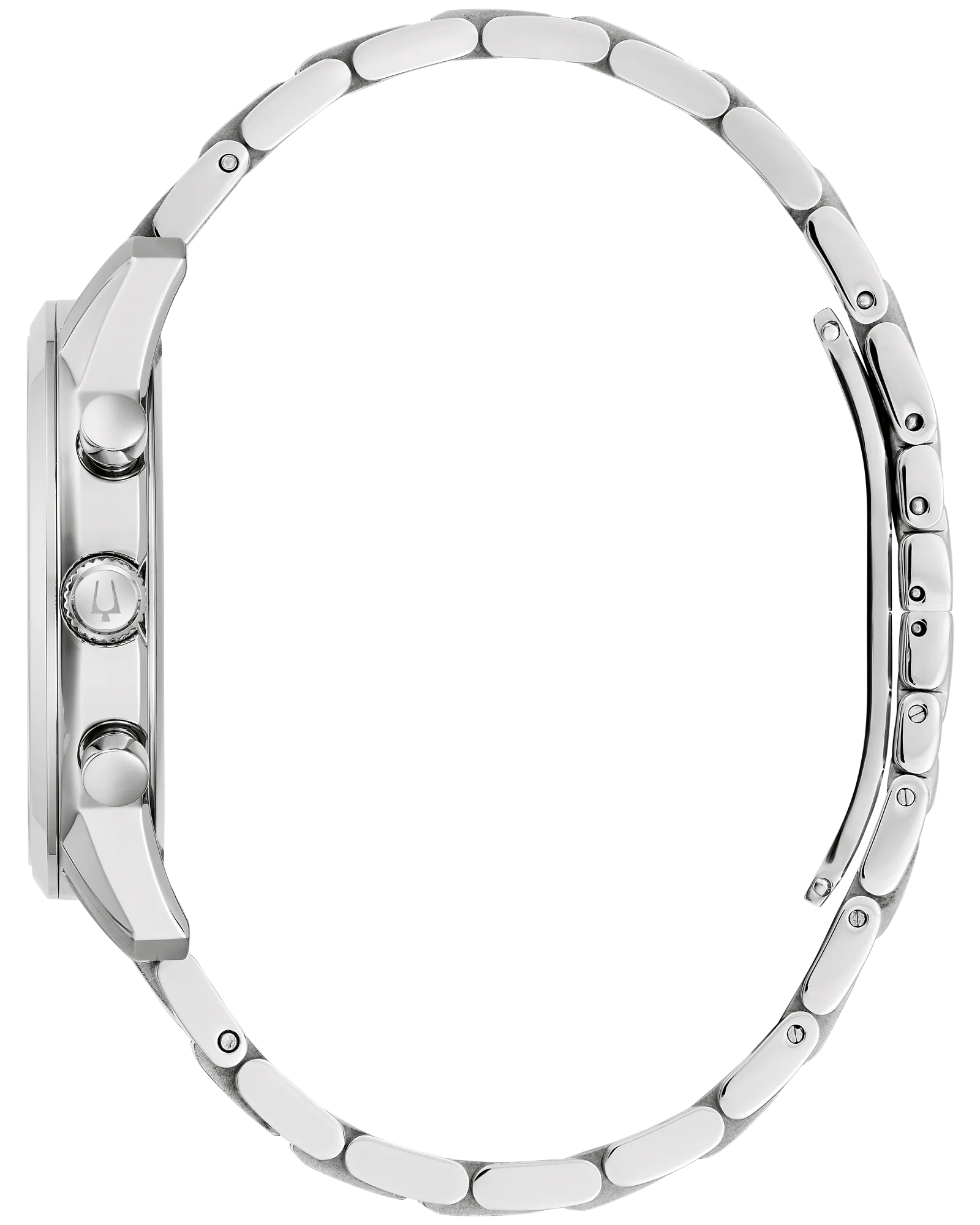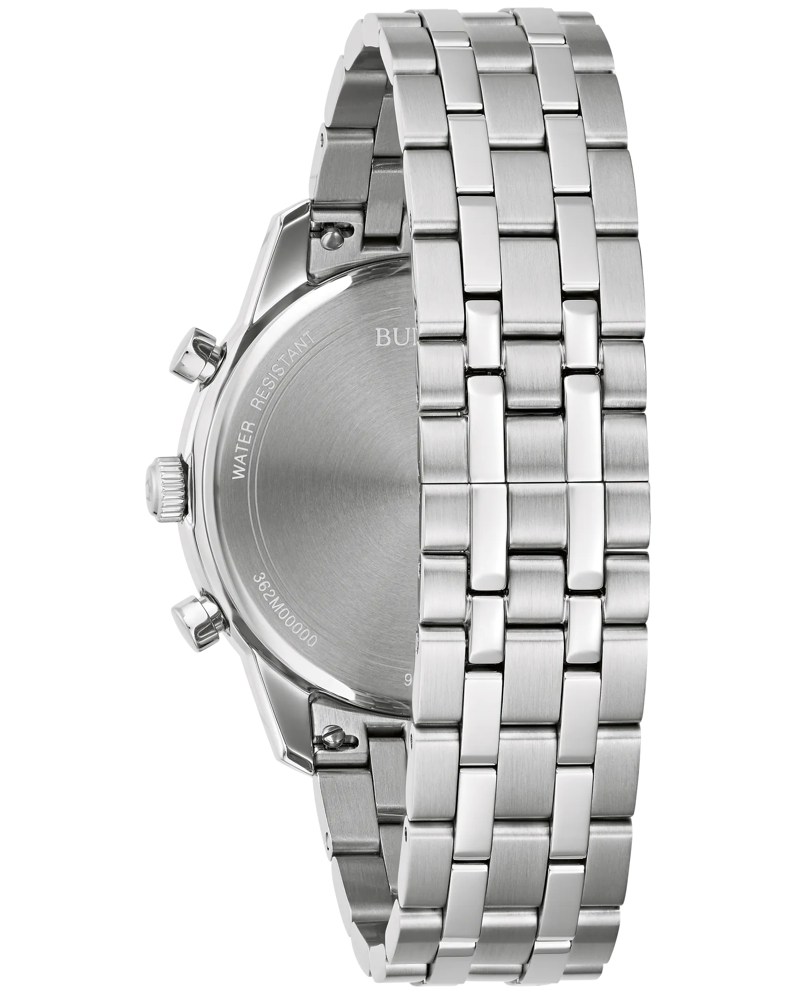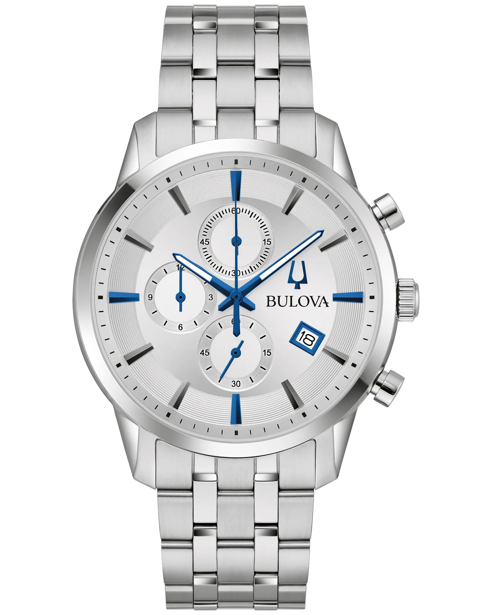 Timeless design and modern functionality define this new 6-hand Bulova men’s chronograph from the Sutton Collection. A silver-tone stainless steel case with a blend of brushing and polishing offers a sophisticated aesthetic and features classically styled chronograph pushers and a domed mineral crystal. A sleek silver-tone dial features applied black and blue hour markers against a circular grooved track, luminescent blue hour and minute hands, and a date display. The chronograph can time events up to 12 hours to the nearest second. For a seamlessly elegant look, the watch is paired with a silver-tone stainless steel multilink bracelet with a deployant closure. Elevate your wardrobe with des