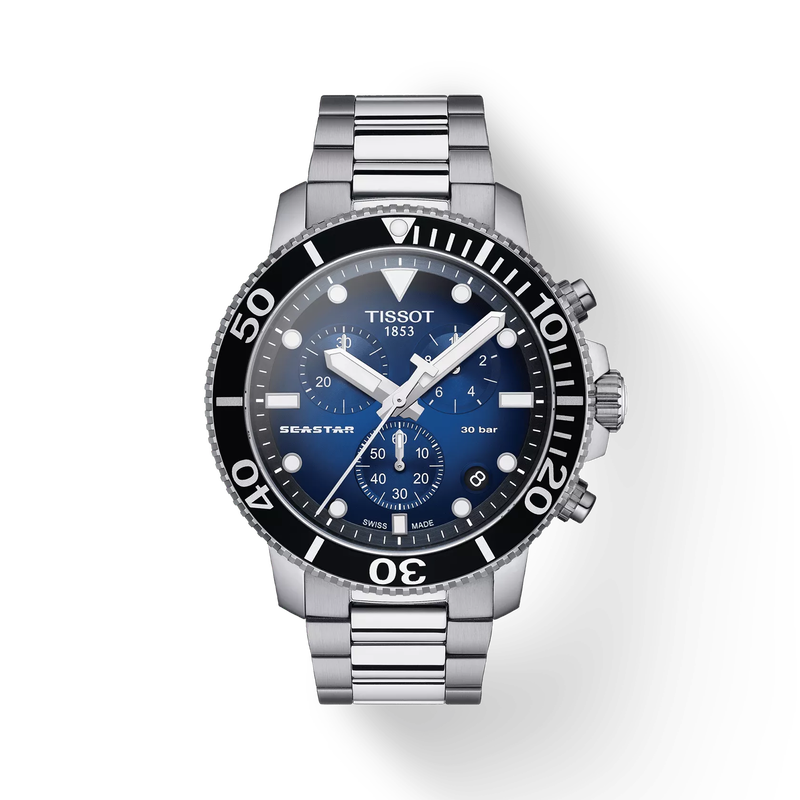 The Tissot Seastar 1000 Quartz Chronograph is a Swiss-made men’s dive watch featuring chronograph functionality, a bold black dial, and professional-grade durability.