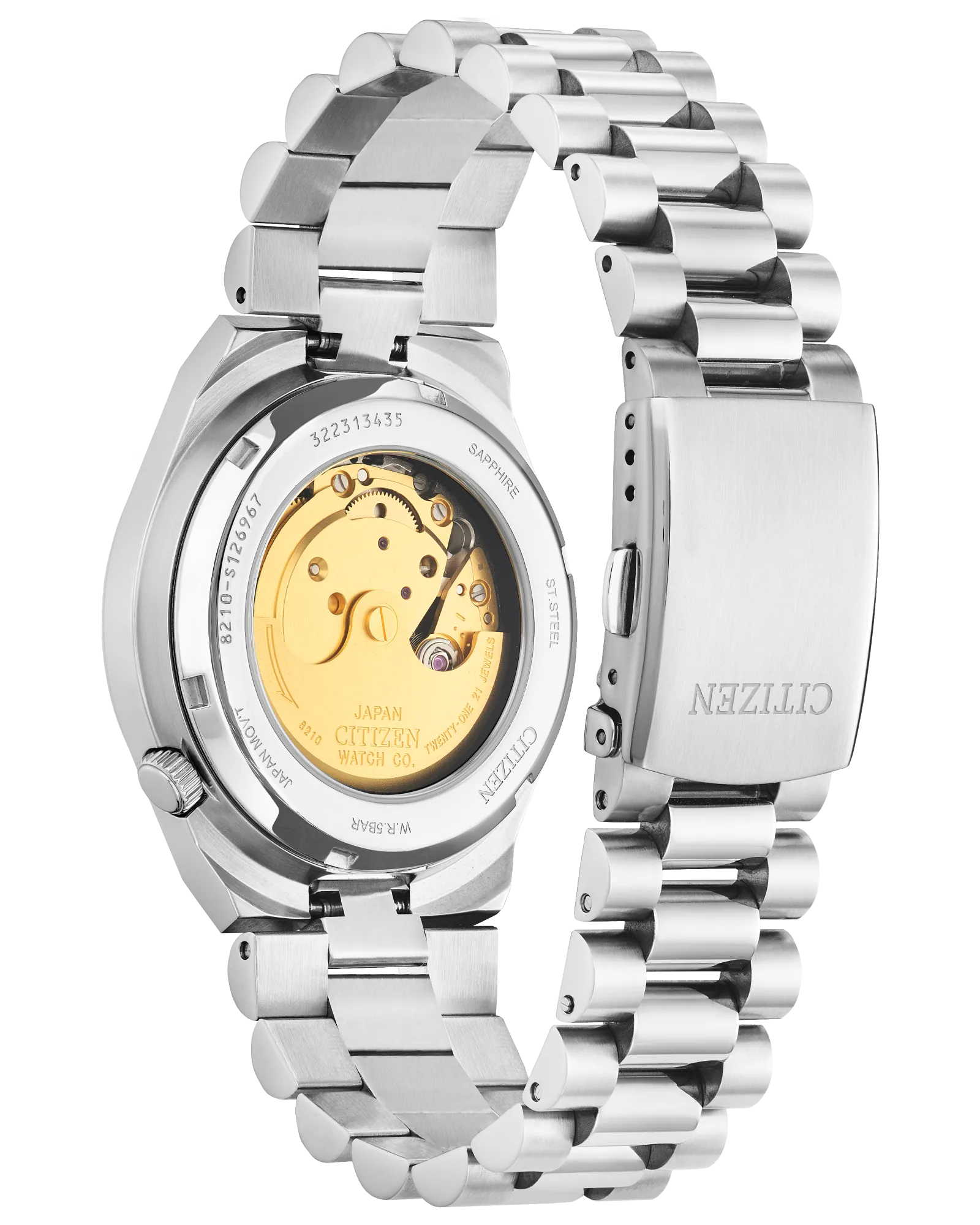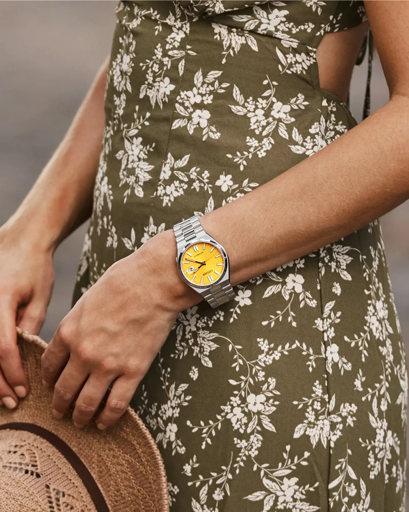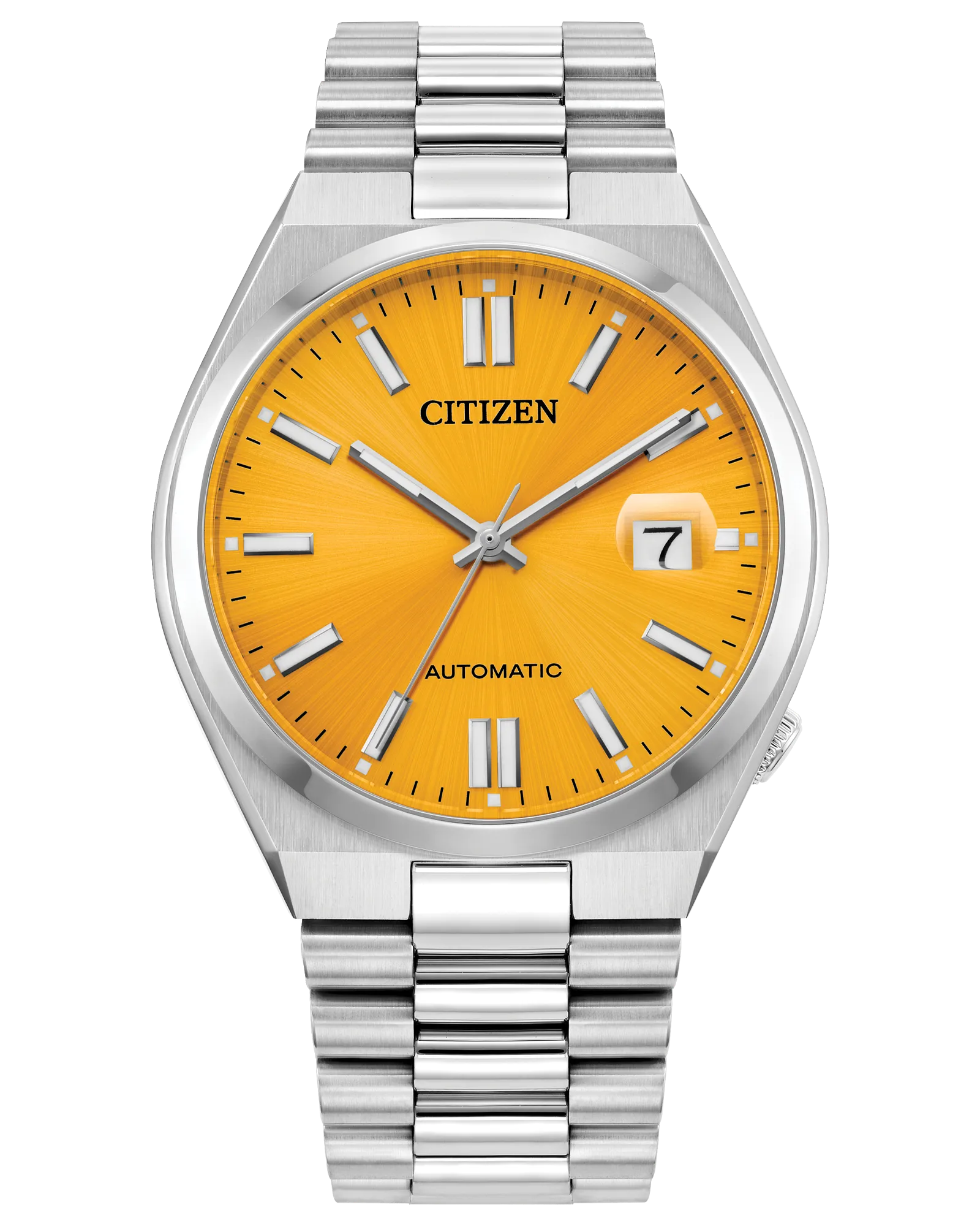 The TSUYOSA Automatic, from the NJ015 series, brings ultramodern sports styling right to your wrist. Executed in a versatile 40mm footprint, the sophisticated design of the watch makes a strong impression via a silver-tone stainless steel case and a seamlessly integrated, matching bracelet. Underneath an anti-reflective sapphire crystal, the sporty timepiece makes use of a sunray yellow dial, with a 3 o’clock date window and contrasting silver-tone details adding to its classic aesthetic. Powered by an automatic movement and offering up to 50 meters of water resistance, the refined timepiece is a daily wearing choice ready for work, play, and everything in between. Caliber 8210. Model #: NJ0150-56Z